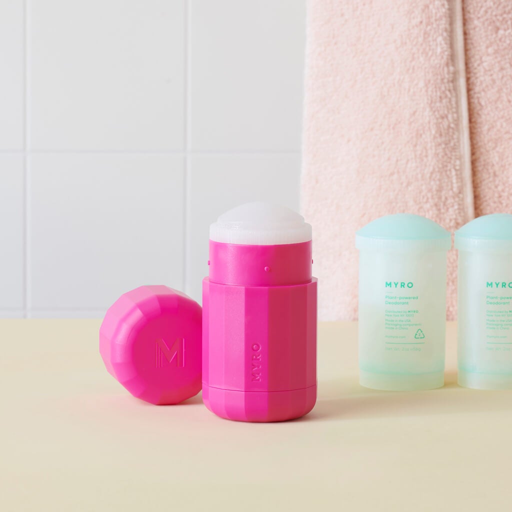 The GOAT. Period. Refillable deo case and reusable body wash bottle with three refills each.